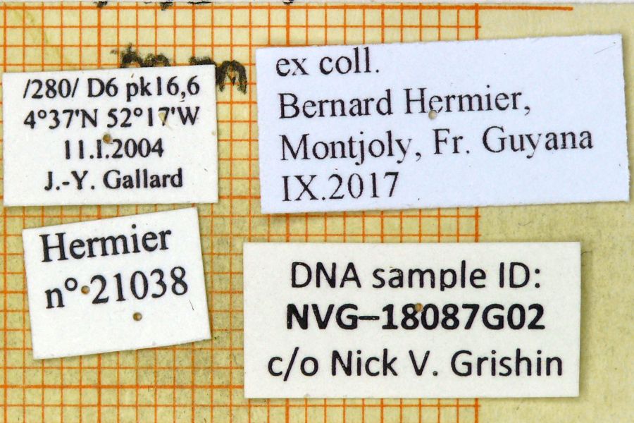 1-3: ♂ Holotypus, Daten siehe Etiketten (fot.: Carlos Mielke, Fotos bearbeitet: Michel Kettner), coll. Departamento de Zoologia, Universidade Federal do Paraná, Curitiba, Paraná, Brazil.