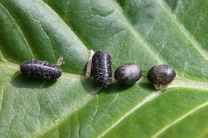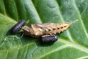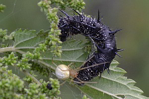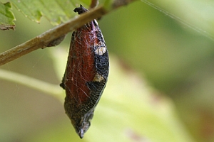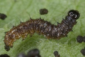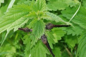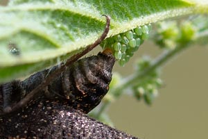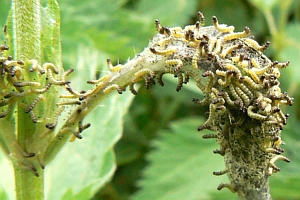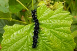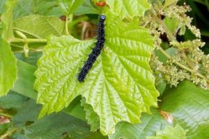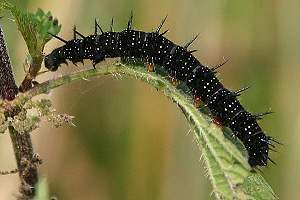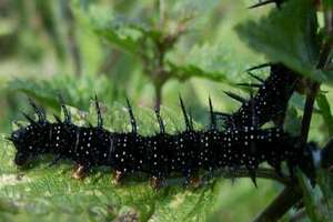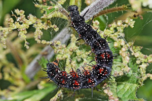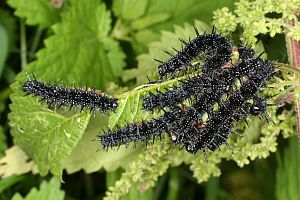 Eine gewisse Ähnlichkeit haben auch schwarze Raupen von V. atalanta. Diese sind jedoch stets deutlich gedrungener. Lange nicht so schlank, wie die A. io-Raupe. Und sie leben einzeln in Blatttüten eingesponnen