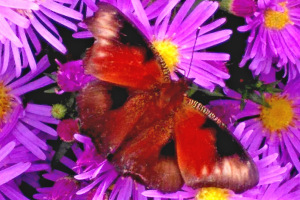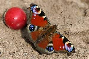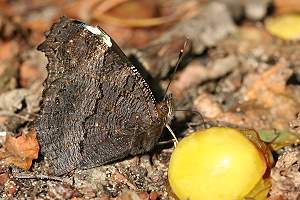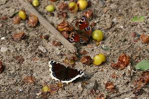 Im Spätsommer ernährt sich A. io gern auch von alkoholisch gärenden Früchten — hier auf Bild 1 in Gesellschaft mit Nymphalis antiopa.