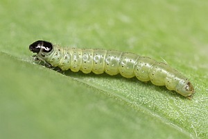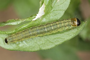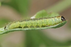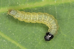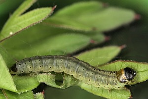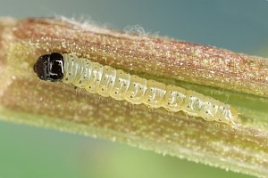 1: 8 mm, halb erwachsen, Österreich, Niederösterreich, Mödling, leg. Raupe an Elsässer Haarstrang (Peucedanum alsaticum) 1. Mai 2012 (leg., cult., det. durch Zucht & Foto Peter Buchner)