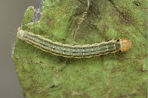 Kaltenbach (1856: 262) meldete: "Die Larve dieser Schabe, fahlweiss, oben etwas grünlich mit blassgelbem Kopf, drei umbragrünen Längslinien und grossem schwarzen Fleck auf jeder Seite des Nackenschildes (Lienig), wurde im Juni und Juli an Centaurea, Sonchus, Carlina und Arctium Lappa angetroffen (frei oder wicklerartig ?)."