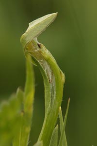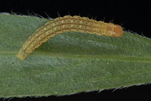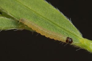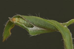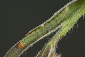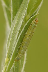 1: Frassbild der Jungraupe, Schweiz, Neuchâtel, Le Landeron, 620 m, flachgründige Felsenheide über Kalk in einem Flaumeichenwald, leg. 1. und 6. Mai 2007 Raupen an Genista sagittalis, Falter geschlüpft am 25. Mai 2007 (Studioaufnahme: Rudolf Bryner), cult. & det. Rudolf BrynerForum