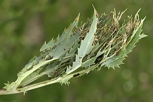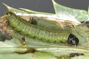 Die von Schütze (1931) wiederholte Angabe "Kaltenbach fand die grüne Raupe an den Wurzelblättern von Cirsium vulgare, sie nagte das Fleisch der Oberseite am Rande streifenartig ab und deckte den leicht versponnenen Blattrand über sich (Rössler)" dürfte auf Verwechslung beruhen.