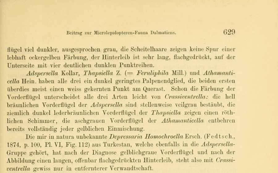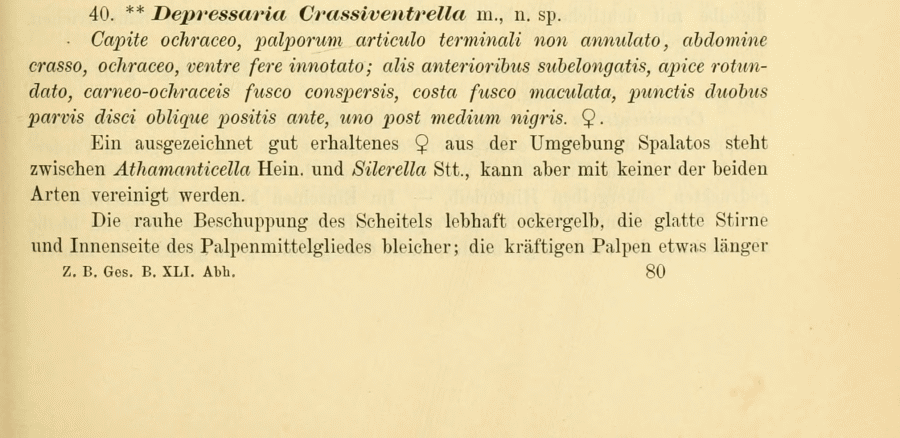 - Erstbeschreibung: Rebel, H. (1891): Beitrag zur Microlepidopteren-Fauna Dalmatiens. — Verhandlungen der kaiserlich-königlichen zoologisch-botanischen Gesellschaft in Wien 41: 610-639.