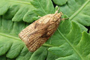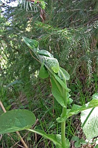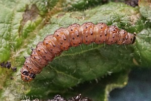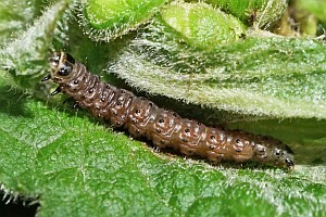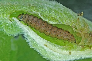 Gravenhorst (1849) meldet in seiner Erstbeschreibung Raupenfunde an Doronicum austriacum, und zwar "jedesmal zu drei gesellig in den zu einem großen Wulst zusammengesponnenen Blättern von Doronicum austriacum." Die "drei" mag Zufall gewesen sein, obige Raupenbilder von H. Deutsch bestätigen aber sowohl die Pflanzenart als auch den "Wulst" zusammengesponnener Blätter.