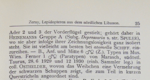 - Erstbeschreibung: Zerny, H. (1933): Lepidopteren aus dem nördlichen Libanon. — Deutsche Entomologische Zeitschrift „Iris“ 47 (2-3): 60-109, pl. 1. Dresden.