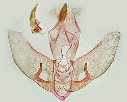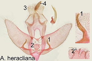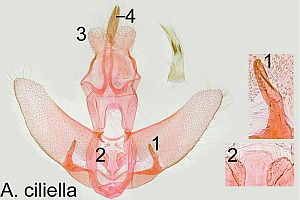Bei A. ciliella und A. heracliana Socii in Standard-Einbettung nicht seitlich ausgezogen, Außenrand gerade (3); Gnathos schmäler mit maximaler Breite von ca. 30 % der Länge (4)