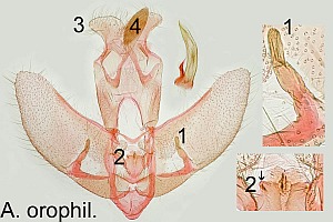 Keine Übereinstimmung mit einer der Vergleichsarten: Bei A. orophilella Socii in Standard-Einbettung bogenförmig nach außen gezogen, Außenrand konvex (3); Gnathos relativ breit mit maximaler Breite von fast 40 % der Länge (4)