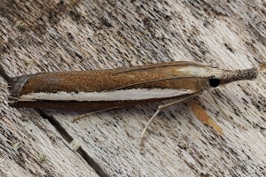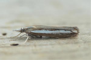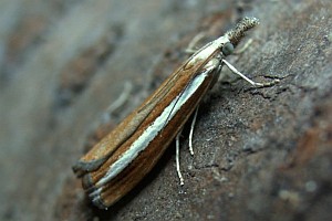 Die dunkelbraunen Formen von Agriphila tristella mit weisser Längsstrieme geben immer wieder Anlass zu Verwechslung mit der viel selteneren Agriphila latistria, bei welcher sich das weisse Längsband bis in die Fransen des Flügelsaumes fortsetzt. Bei Agriphila tristella endet die weisse Strieme deutlich vor dem Flügelsaum, bzw. läuft in mehreren "Fingern" aus. [Rudolf Bryner im Forum], mit kleiner Ergänzung von Tina Schulz
