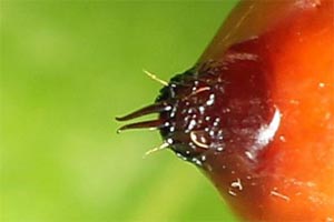 2-4: vorletztes Stadium, Deutschland, Thüringen, Umg. Jena-Göschwitz, an Schlehe (Prunus spinosa), 26. April 2009 (leg., cult., det. & Fotos am 28. April 2009: Heidrun Melzer)