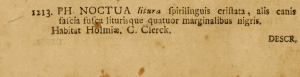 - Erstbeschreibung: Linnaeus, C. (1761): FAUNA SVECICA Sistens Animalia SVECIÆ Regni: MAMMALIA, AVES, AMPHIBIA, PISCES, INSECTA, VERMES. Distributa Per CLASSES & ORDINES, GENERA & SPECIES, Cum Differentiis Specierum, Synonymis Auctorum, Nominibus Incolarum, Locis Natalium, Descriptionibus Insectorum. Editio Altera, Auctior: Frontispiz, [i-xlviii], 1-578, pl. I-II. STOCKHOLMIÆ (LAURENTII SALVII).