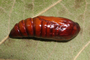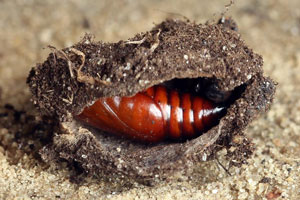 4-5: Puppe in geöffnetem Erdkokon und Kremaster: Russland, Oblast Moskau, Bezirk Orechowo-Sujewo, Dorf Topolinyy, 118 m, Raupe an Weide (Salix sp.), leg. 28. Mai 2016, Fotos 23. Juli 2016 (leg., cult., det. & fot.: Andrey Ponomarev)