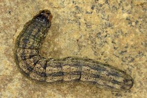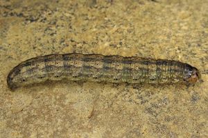 1: knapp unter der Bodenoberfläche in lockerer Erde befand sich eine Raupe in Häutungsruhe, Deutschland, Niedersachsen, Region Hannover, Sehnde, Weg am Mittellandkanal, 67 m, 16. September 2015 (cult. & fot.: Tina Schulz), det. durch GU des in der Puppenhülle abgestorbenen Falters Thomas Fähnrich & Tina Schulz
