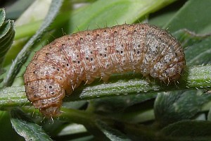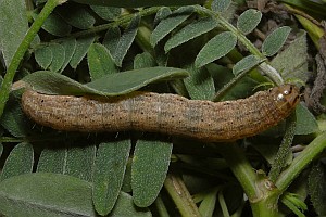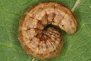 12-13: Deutschland, Niedersachsen, Region Hannover, Sehnde, Weg am Mittellandkanal, 67 m, 17. September 2015, Raupe in lockerer Erde vergraben (cult. & fot.: Tina Schulz), det. durch GU des in der Puppenhülle abgestorbenen Falters Thomas Fähnrich & Tina Schulz