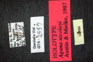 - Erstbeschreibung: Austin, G. T. & O. H. H. Mielke (1998): Hesperiidae of Rondônia, Brazil: Aguna Williams (Pyrginae), with a partial revision and descriptions of new species from Panama, Ecuador, and Brazil. — Revista brasileira de Zoologia 14 (4): 889-965. [PDF auf scielo.br]