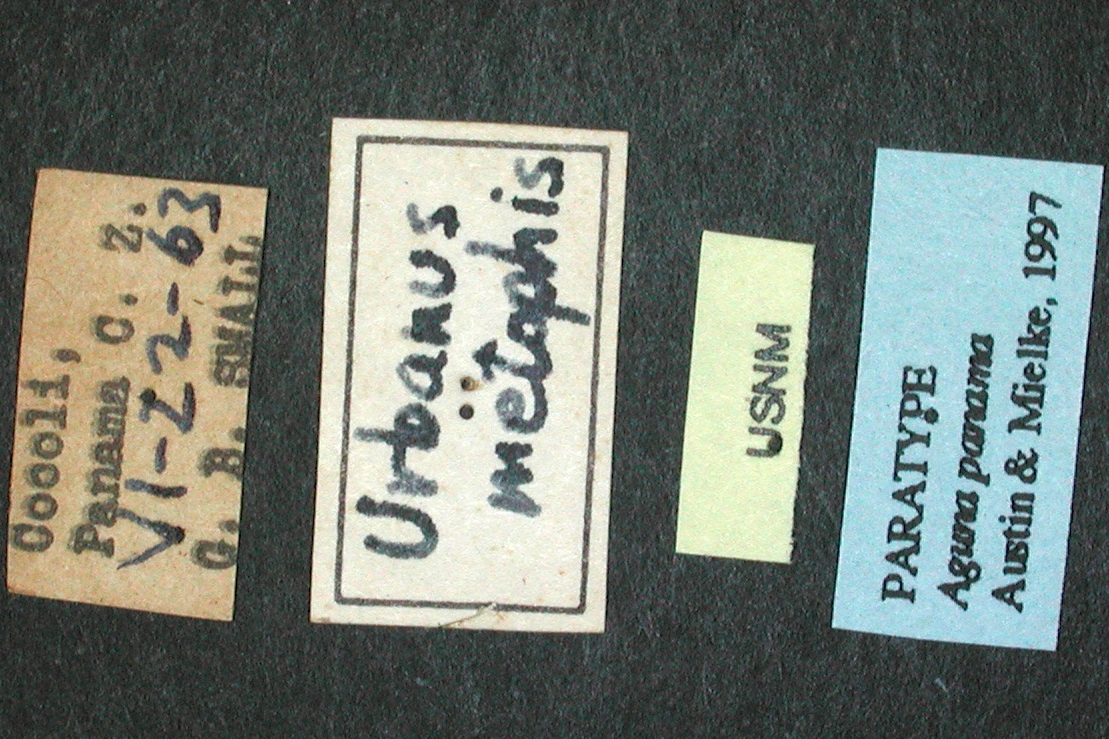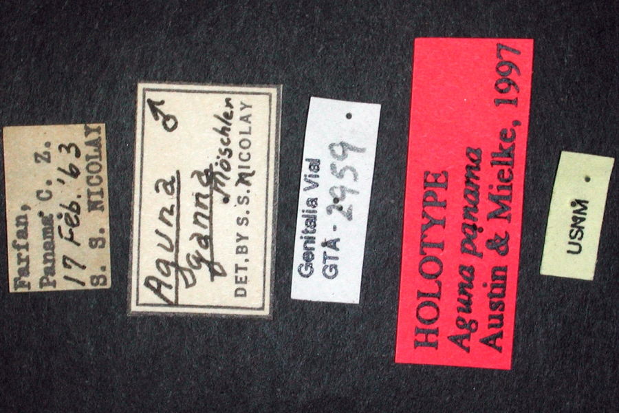 - Erstbeschreibung: Austin, G. T. & O. H. H. Mielke (1998): Hesperiidae of Rondônia, Brazil: Aguna Williams (Pyrginae), with a partial revision and descriptions of new species from Panama, Ecuador, and Brazil. — Revista brasileira de Zoologia 14 (4): 889-965. [PDF auf scielo.br]