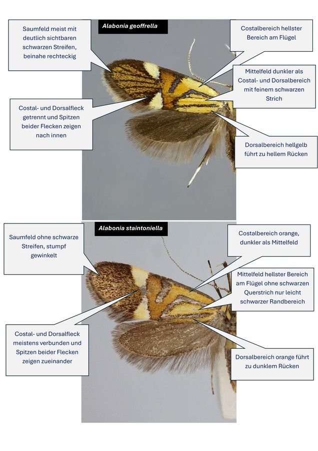 Alabonia geoffrella und Alabonia staintoniella sind in Mitteleuropa eigentlich kaum verwechselbar - aber ab und zu passiert es doch. Da sich abzeichnete, dass sich die Vorkommen der beiden Arten kaum überschneiden, blieb u.a. die Frage nach Vorkommen von A. geoffrella im Osten Österreichs und weiter in Osteuropa. Zum Burgenland hatte Kuzmits (2000: 18) eine Reihe von Funden aus den Jahren 1977 - 1994 aufgelistet. Kuzmits (2003: 66) korrigierte dann selbst: "Richtigstellung: In meiner letzten Veröffentlichung (Kuzmits 2000) kam es zu einer Fehlbestimmung. Bei der Art Alabonia geoffrella (Linnaeus, 1767) handelt es sich bei allen genannten Funden um die Art Alabonia staintoniella (Zeller, 1850) aus der Familie Oecophoridae." Da die Art bei Huemer (2013) in Österreich nur aus dem Osten (Niederösterreich und (wohl irrtümlich) Burgenland) gemeldet worden war, fragte Thomas Guggemoos am 30. Januar 2026: ["Wer kann was zu Alabonia geoffrella in Österreich beitragen?"]. Das Ergebnis bis zum 1. Februar 2026: Weder Peter Buchner noch Peter Huemer haben je einen Beleg aus Österreich gesehen. Die Meldungen zu Österreich werden also mit einem "dicken Fragezeichen" versehen - vermutlich sind sie falsch.