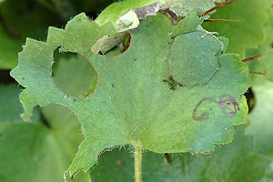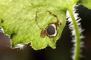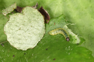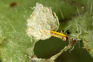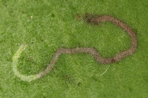 Die Raupe verbringt die erste Lebensphase minierend in den Blättern der Nahrungspflanze. Die am Ende dieser Phase mehrere Zentimeter lange Gangmine endet in einer Platzmine von etwa einem halben Zentimeter Durchmesser (Befallsbild 3).
