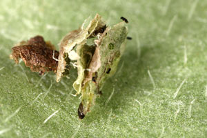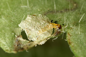 Die anschliessende Entwicklungsphase zeichnet sich dadurch aus, dass die Raupengehäuse nicht mehr aus ganzen Türmen, sondern aus runden, etwa 10 mm grossen Blattstücken bestehen, welche die Raupen auf die Unter- oder Oberseite von Blättern spinnen und darunter leben. Dabei werden Teile des lebenden Blattes ebenso gefressen wie Teile der abgetrennten Deckscheibe (Befallsbild 10).