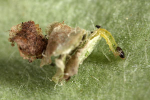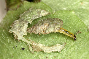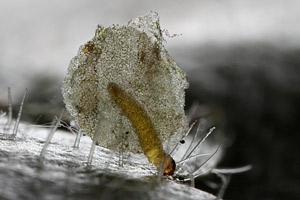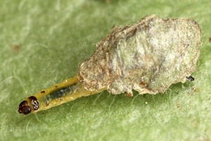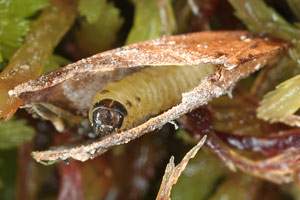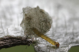 Aus dem runden Blattdeckel schneidet sich die Raupe einen deutlich kleineren ovalen Blattsack aus. Diesen benützt sie jetzt als Gehäuse im Stil einer Psychidenraupe. Ein Unterschied besteht allerdings vorerst noch: Sowohl das vordere wie das hintere schmale Ende ist offen und kann durch die Raupe wahlweise als Kopfende benutzt werden. In dieser Phase scheinen die Raupen die Nahrungsaufnahme eingestellt zu haben. Im Zuchtgefäss ist jedenfalls kein frischer Raupenkot mehr zu beobachten (Bilder 3 und 4 der erwachsenen Raupe).
