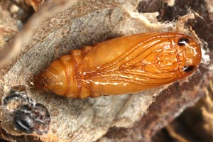 Im Vergleich zur Zimmerzucht verläuft die Raupenentwicklung im angestammten Lebensraum deutlich langsamer. Für die Diapause verkriechen sich die Raupen mit ihren Gehäusen am Boden zwischen welke Pflanzenteile und Moos. Ganz offensichtlich bevorzugt wird in der durchgeführten Zucht eine nicht näher bestimmte Moos-Art, vermutlich ein Sternmoos (Mnium). Tief in den Polstern befestigten die Raupen ihre Säcke jeweils an einem der beiden schmalen Enden an den Moossprossen. Das Innere des Gehäuses ist jetzt dicht mit bräunlich-weisser Seide ausgesponnen und allseitig verschlossen. Der Raupenkopf liegt am nicht angesponnenen schmalen Ende des ovalen Gehäuses.