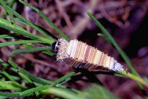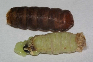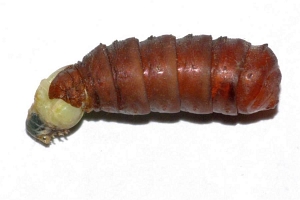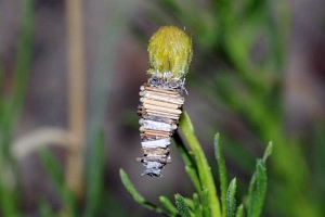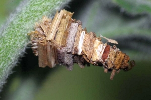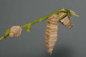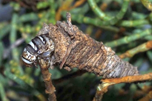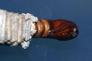 3: ssp. arabica (Wiltshire, 1949), maennliche Puppe hat sich kurz vor dem Schlupf aus dem Sack herausgeschoben: Vereinigte Arabische Emirate, Abu Dhabi Emirate, Al Dhafrah AFB (24° 15' N/54° 30' E), 23 m, 13. November 2017Forum