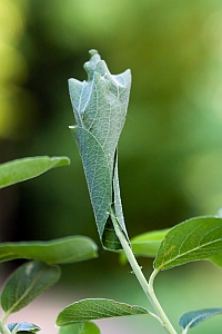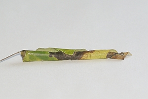 1: Ungeöffnete Raupenwohnung aus versponnenen Blättern, 13. Mai 2006 an Salweide (Salix caprea) (Foto: Peter Buchner), leg., cult. & det. Peter Buchner.