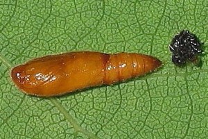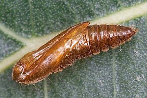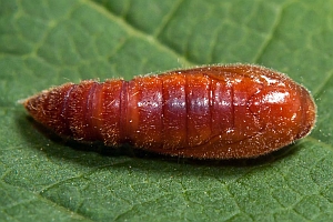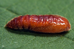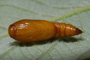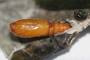 1: Österreich, Niederösterreich, 5 km NW Schwarzau am Steinfeld, leg. 13. Mai 2006 Raupe an Salweide (Salix caprea), Foto der 8 mm langen Puppe 25. Mai 2006 (Foto: Peter Buchner), leg., cult. & det. Peter Buchner. Die Verpuppung erfolgte im Wohngespinst der Raupe, welches für das Foto geöffnet wurde.