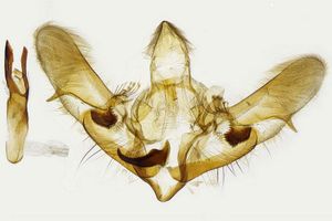 Sexualdimorphismus der Falter: Der graue subapikale Fleck entlang des Costalrandes tritt nur bei Männchen auf. Die Weibchen sind durchschnittlich kleiner und wirken auch heller, weil der Weißanteil leicht erhöht ist [Helmut Kolbeck].