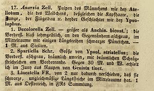 - Kaltenbach, J.H. (1856): Die deutschen Phytophagen aus der Klasse der Insekten, oder Versuch einer Zusammenstellung der auf Deutschlands Pflanzen beobachteten Bewohner und deren Feinde. — Verhandlungen des naturhistorischen Vereines der preussischen Rheinlande, 13: 165 - 265. [PDF auf zobodat.at]
