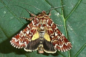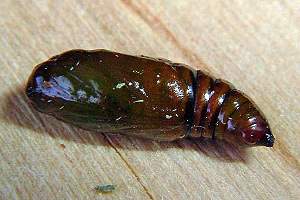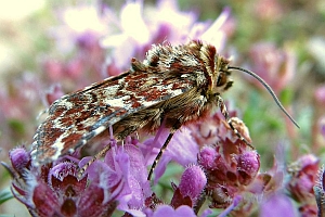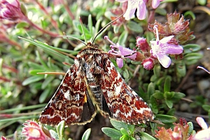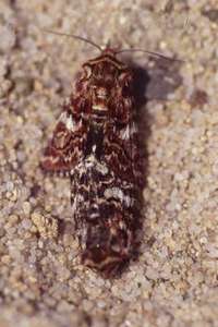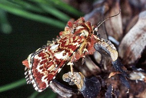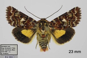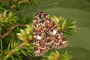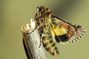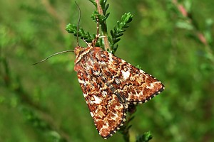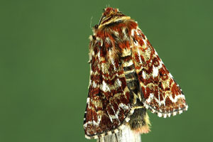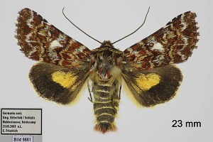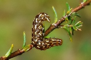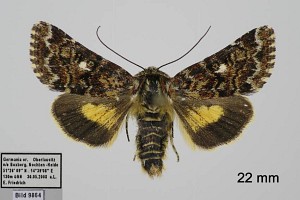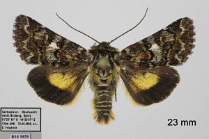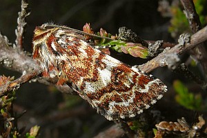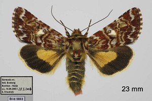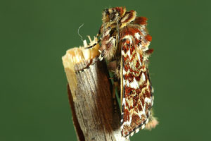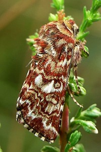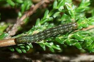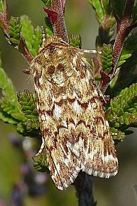 1: Deutschland, Niedersachsen, Krelinger Heide, Autobahnkreuz A7/A27, Raupe gekäschert aus Calluna vulgaris am 13. Juni 2006, Falter geschlüpft 12. Juli 2006 (Foto: Thomas Fähnrich), det. Thomas Fähnrich