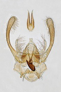 1-2: ♂, Deutschland, Baden-Württemberg, 78176 Blumberg, Südhang mit Gebüschstreifen, Trespen-Halbtrockenrasen auf Kalk, 780 m, aus Vegetation aufgescheucht, 1. Juli 2013 (leg., det., präp. & Foto: Hans-Peter Deuring). Bild [1] zeigt oben zwischen den Valven die Juxta, die sich bei der Präparation abgelöst hat.Forum