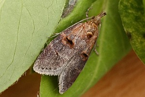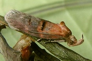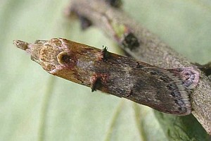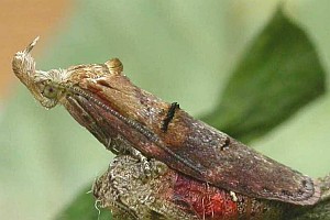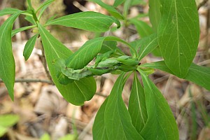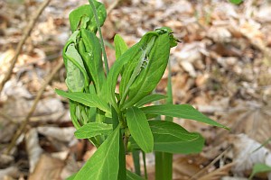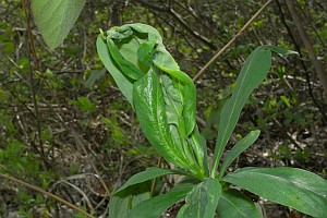 1: zusammengesponnene Blätter von Seidelbast (Daphne mezereum): Deutschland, Thüringen, "Neuberghutung" westl. Wiesenthal-Rhön, 25. Mai 2008 (det. & Foto: Uwe Büchner)Forum