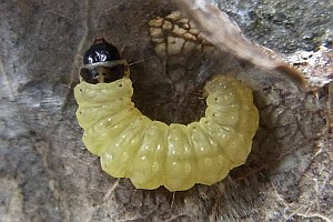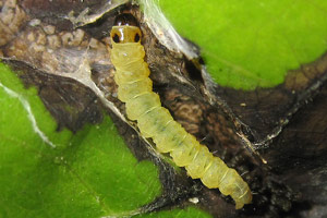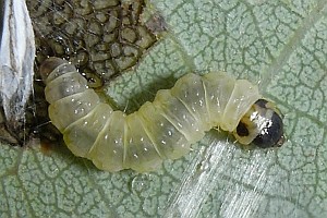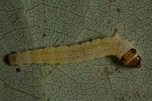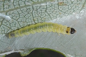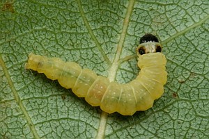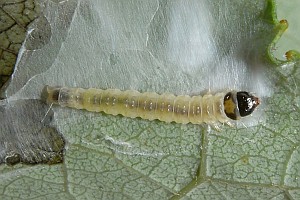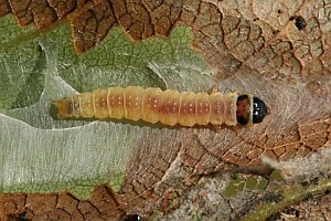 Kennel (1916: 444) schloss sich den bisherigen Beobachtungen an: "Die Raupe ist einfarbig gelblich, mit gleichfarbigen Wärzchen, der Kopf schwarz oder dunkelbraun, Nacken- und Analschild sind wie der Körper gefärbt, ersteres seitlich mit einem schwarzen Punkt. Sie lebt im Juni und Oktober in einem umgeschlagenen Blattrand von Populus tremula."
