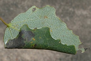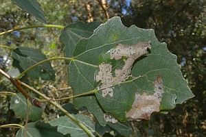 Schütze (1931: 48) meldete dazu passend: "Zwischen zwei Blättern oder im umgeschlagenen Blattrand an Populus tremula: der obere Teil der Wohnung wird braun und verdorrt. Verwandlung in der Wohnung im Frühjahr (Sorhagen), auch Populus italica [Populus nigra var. italica] (Stange)."