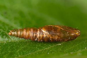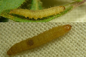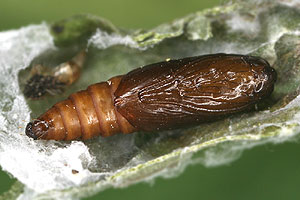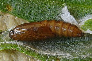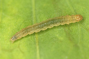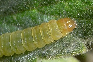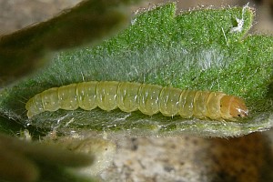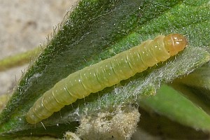 Hancock et al. (2015: 66) liefern eine ähnliche Liste aus Großbritannien: "Ovum. Laid singly in May - June and August, usually on the underside of a leaf of salad burnet (Sanguisorba minor), or species of thyme (Thymus), strawberry (Fragaria, including cultivated varieties), and Potentilla". Demnach fressen die jungen Raupen zunächst aus einem lockeren Gespinst mit ein paar Fäden an der Blattunterseite, später aus einer Seidenröhre zwischen zwei Blättern heraus an der Blattoberseite.