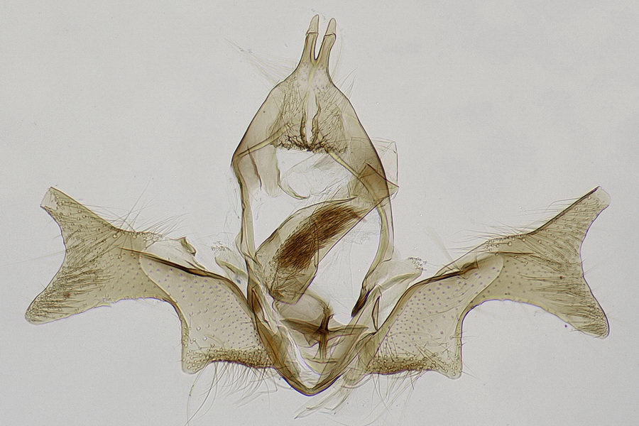 1: Genitalpräparat eines im Forumsbeitrag abgebildeten ♂, Österreich, Steiermark, Graz, St. Peter, ca. 380 m, Garten, Mischwaldrand, am Licht, 22. April 2017 (det., präp. & Foto: Horst Pichler) und [Genitalpräparat neu fotografiert]Forum