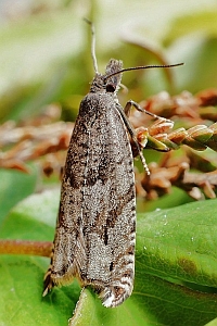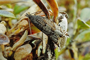 Und Schmid (2019: 662) kann aus den Alpen berichten: "Die Falter schlüpfen zeitig im Frühling. Die Weibchen legen ihre Eier einzeln an die Raupennährpflanze Erika (Erica carnea) (1, 2). Über der Waldgrenze ist Besenheide (Calluna vulgaris) die Nährpflanze. Die Jungraupe fertigt eine feine Gespinströhre an, in die sich sich bei Störung blitzschnell zurückzieht (3, 4). Die erwachsene Raupe lebt in einem System von Gespinströhren mit Pflanzenpolster (6). Im Herbst fertigt sie einen recht dichten Kokon an, der außen mit Pflanzenteilen und Kot belegt ist. Darin verpuppt sie sich und überwintert (5). [...]"