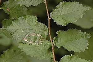 2: Deutschland, Sachsen, Dübener Heide, Gruna bei Eilenburg, zwischen aufeinander gesponnen Ulmenblättern (Ulmus minor), 13. September 2008 (Foto: Heidrun Melzer), leg., cult. & det. Heidrun Melzer