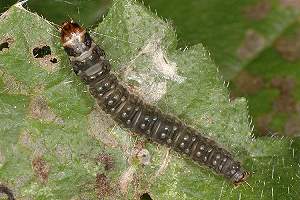 1: vorletztes Stadium, Deutschland, Sachsen, Dübener Heide, Umg. Doberschütz, zwischen aufeinander gesponnen Birkenblättern (Betula pendula), 18. August 2009 (leg., cult., det. & Foto am 23. August 2009: Heidrun Melzer)