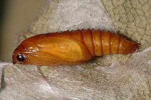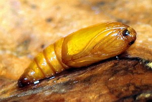 2: Deutschland, Sachsen, Dübener Heide, Gruna bei Eilenburg, Raupe leg. 13. September 2008, verpuppt nach Überwinterung, 13. März 2009 (Foto: Heidrun Melzer), cult. & det. Heidrun Melzer