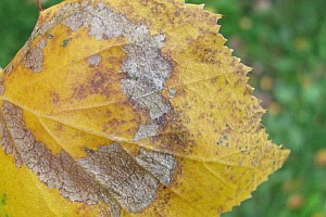 3: aufeinander gesponne Birkenblätter mit typischem Fraßbild, Russland, Oblast Moskau, Bezirk Orechowo-Sujewo, Dorf Topolinyy, 118 m, 7. Oktober 2011 (Foto: Andrey Ponomarev)Forum