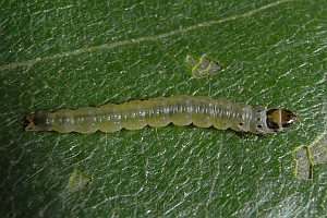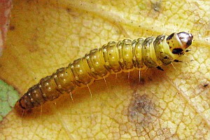 2: vorletztes Stadium, Deutschland, Sachsen, Dübener Heide, Umg. Doberschütz, zwischen aufeinander gesponnen Lindenblättern (Tilia cordata), 18. August 2009 (leg., cult., det. & Foto: Heidrun Melzer)