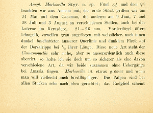 - Erstbeschreibung: Staudinger, O. (1879-1880 [159-368: 1879; 369-435: 1880]): Lepidopteren-Fauna Kleinasien's. — Horae societatis entomologicae rossicae 15: 159-435. St. Pétersbourg (V. Besobrasoff & Comp.).
