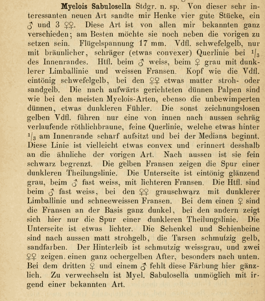 - Myelois sabulosella Staudinger, 1879 [Originalkombination]