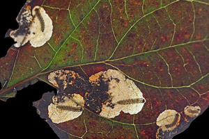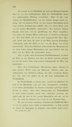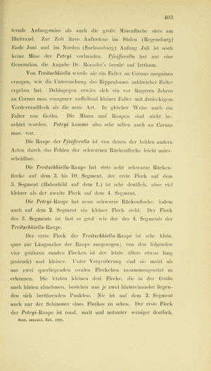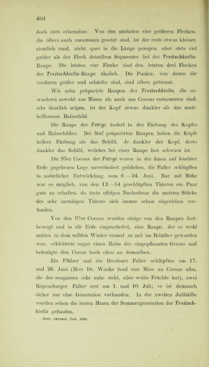 Dabei gab es noch immer gute Gründe, diese Synonymisierung zu hinterfragen. So zeigte R. Bryner am 27. September 2006 im [Lepiforum] Raupenspuren und Raupen an Cornus sanguinea und wunderte sich: "Von Antispila treitschkiella findet man fast immer bloss die bereits verlassenen Minen mit dem charakteristischen ovalen Loch, hier an Hartriegel (Cornus sanguineum). Interessanterweise schreibt Peter Buchner in der Bestimmungshilfe, dass er diese Art nur an Cornus mas (Kornelkirsche) gefunden habe. [...] In meiner Gegend ist die Schwesterart Antispila metallella bedeutend seltener, A. treitschkiella dagegen praktisch omnipräsent an den überall häufigen Hartriegelbüschen an Waldrändern, in Hecken oder entlang von Waldwegen. Ich habe sie auch schon mehrfach gezüchtet. Da gibt's also noch etwas zu erforschen und ich werde die Raupen nach den von Peter genannten Unterscheidungsmerkmalen untersuchen." P. Buchner antwortete am [9. November 2006] unter dem Betreff "Zweifel an Antispila treitschkiella". R. Bryner versprach, dran zu bleiben - und er ist jetzt auch einer der Autoren der Studie von Nieukerken et al. (2018).