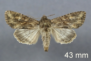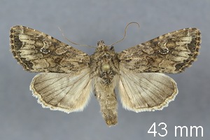 Apamea anceps weist typischerweise dunklen Adern im Subapikalfeld der Vorderflügel auf (siehe Markierung, entspricht Falterbild 3). [Daniel Bartsch]