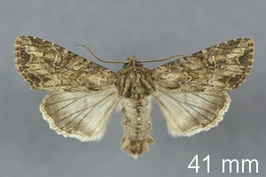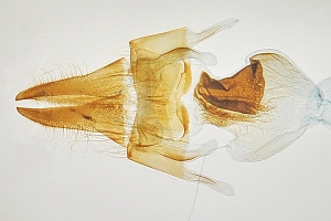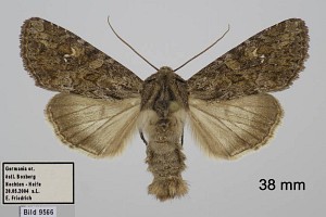- die Größe: Apamea anceps ist deutlich größer. (Auf einem Foto natürlich nicht so gut zu erkennen, aber der Vergleich mit dem Gazematerial zeigt [hier], daß es sich um ein etwa mesapameakleines Tier handelt.)