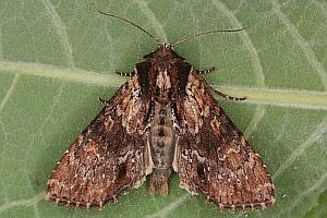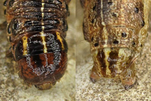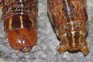 - Apamea crenata: Dorsale + Suborsalen auf Nackenschild gleichbreit (-> gutes Unterscheidungsmerkmal zu A. epomidion), Grundfarbe meistens Rosabraungrau, dann dunkelbraune Kopfkapsel mit schwarzer Netzmusterung (manche Tiere aber bleigrau, bei denen ist Kopfkapsel fast schwarz), Afterplatte variabel, keine Diapause im Winter, kurz vor Verpuppung wird sie auf einmal sehr blass