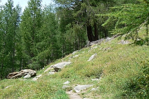 1: Schweiz, Wallis, Saastal, Saas-Almagell, 1720 m, Höhenwanderweg in lichtem Lärchenwald mit Magerwiese, Falter unter Felsvorsprung, 12. August 2011 (Foto: Hildegard Stalder)Forum